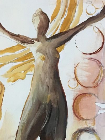 I put up several overlapping sheets of Nideggan paper and chose a palette that mimicked the earth colors in the caves. I used graphite in several forms, charcoal, ochre, chalks, acrylic paint, gesso, and fixative. I had purchased some earth pigments excavated in Montignac, France - the town of the fabulous Lascaux cave - and threw them into the mix. I drew, scraped, stenciled, painted over and redrew. I incorporated guided meditation visions, my daily walk observations, whatever was running through my mind that day. The works became an unfolding story I entertained myself with and learned from.